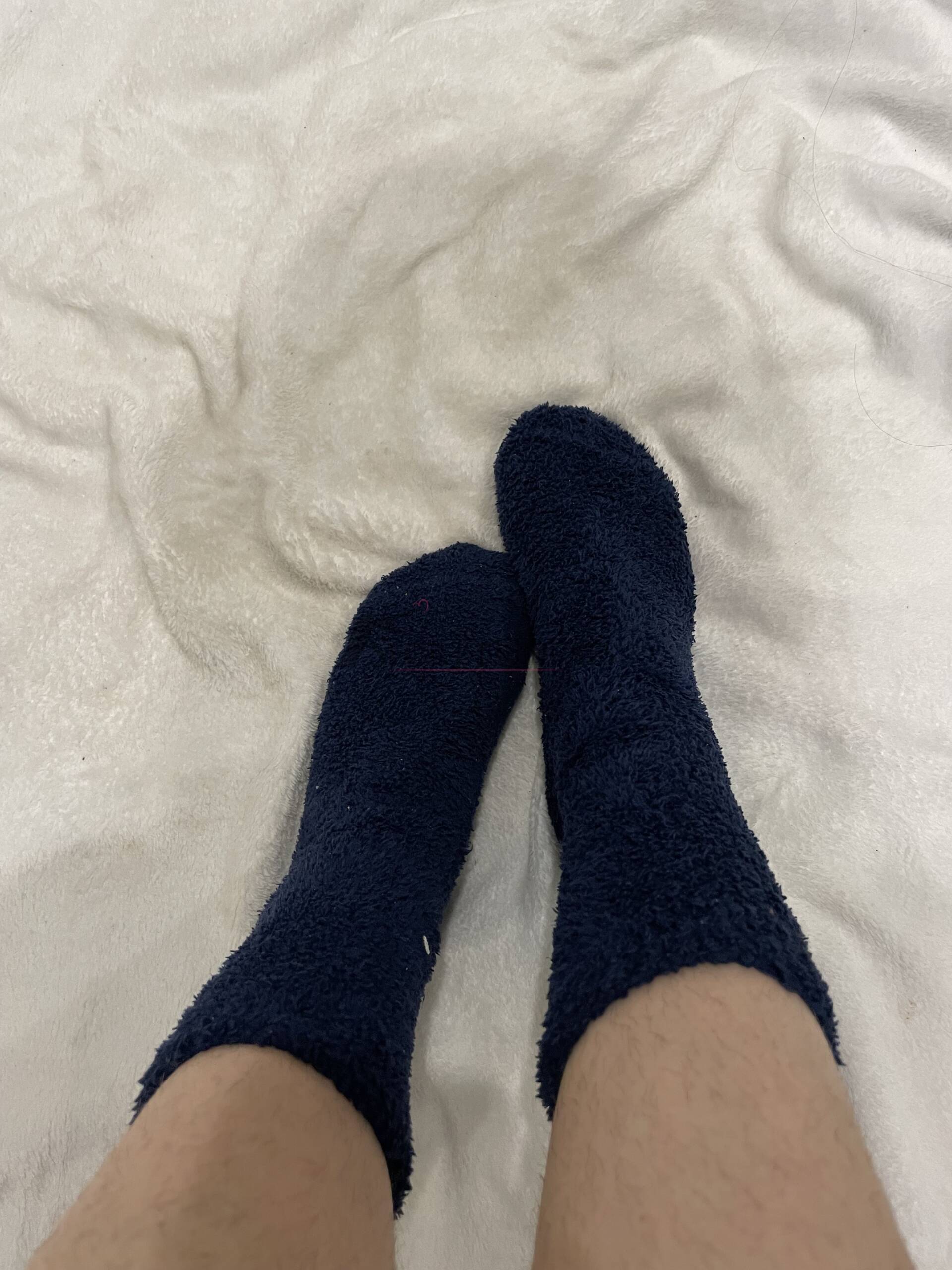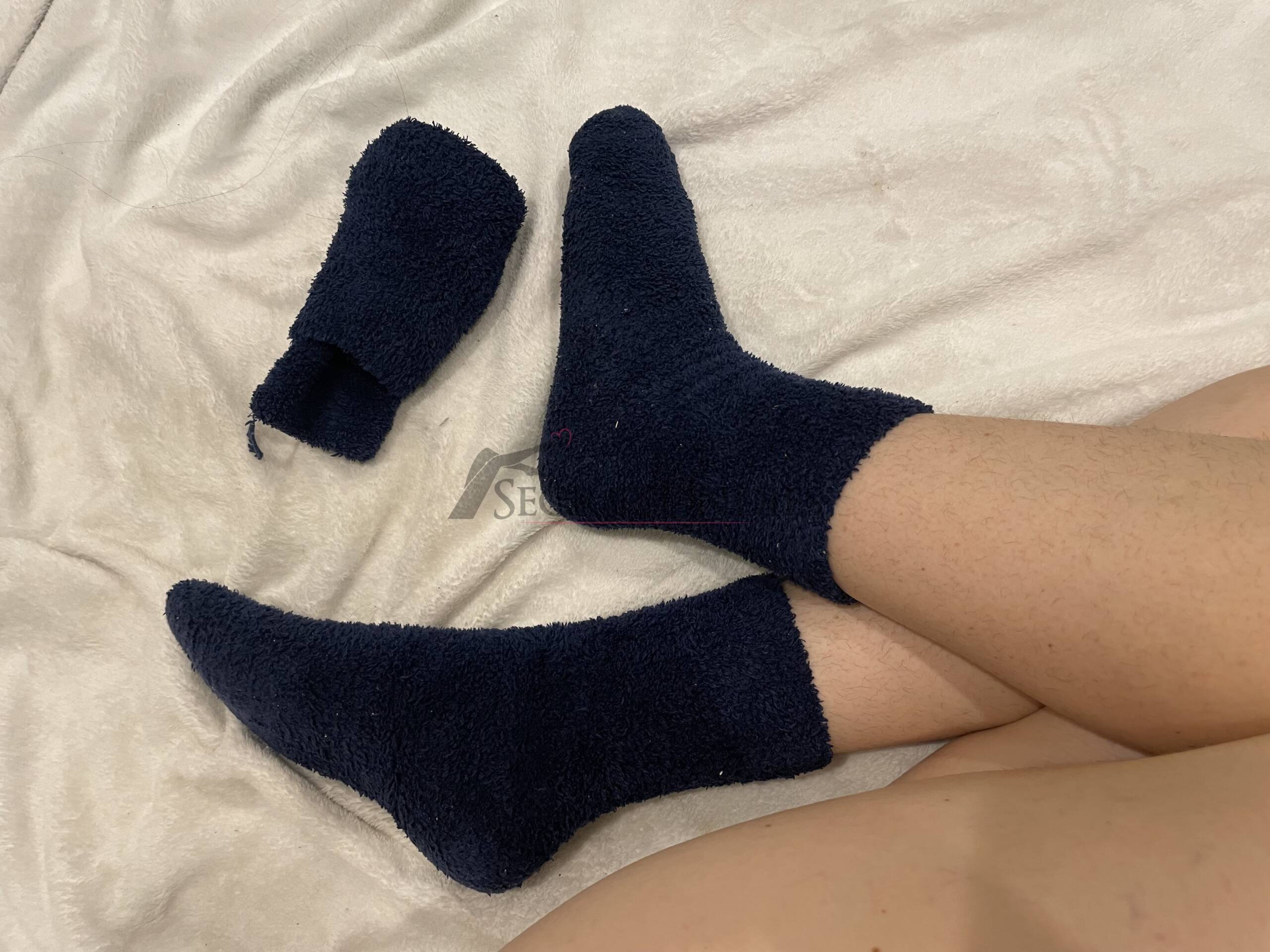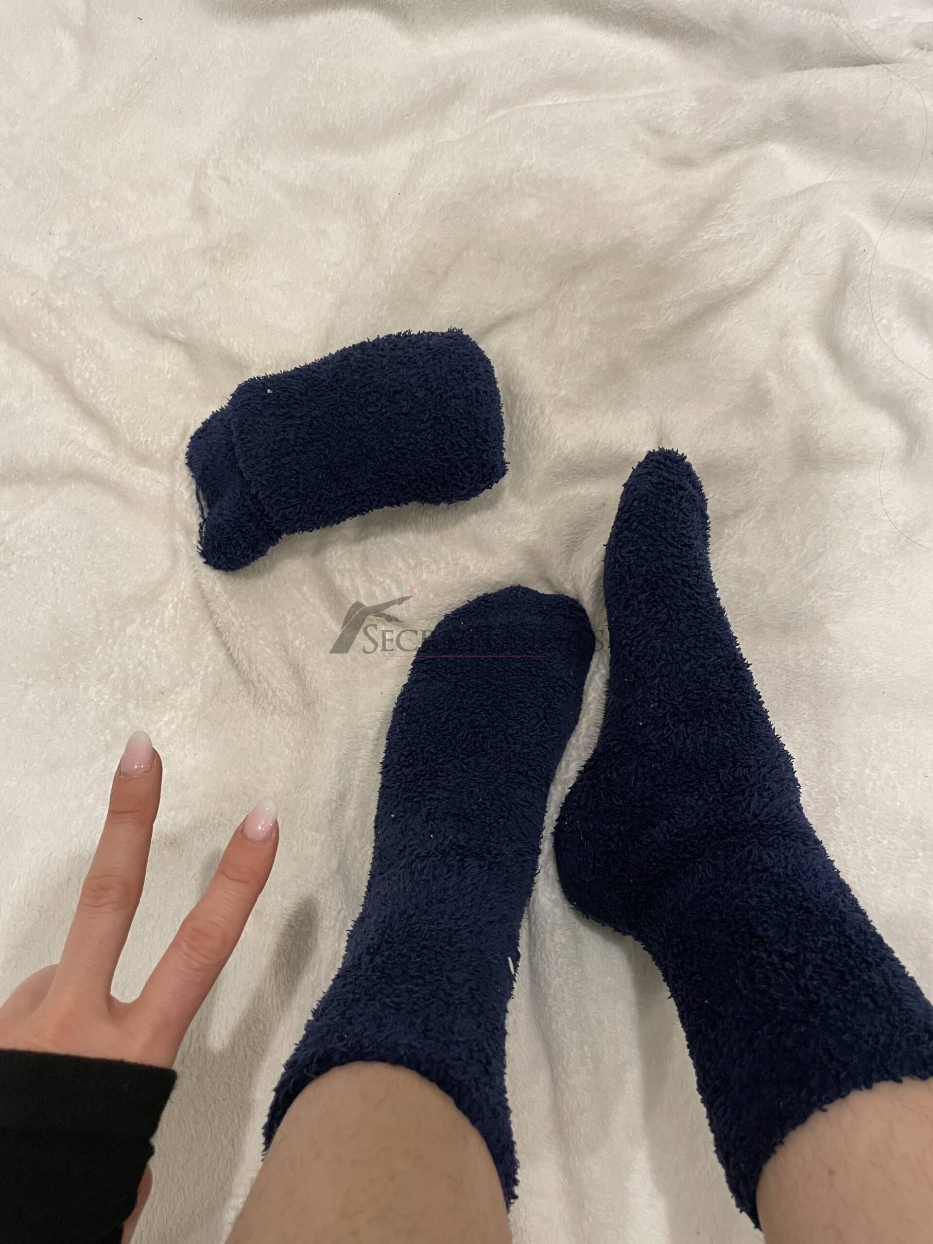 Dieses Doppelpack besteht aus dunkelblauen, flauschigen Wollsocken ohne Muster oder Verzierungen. Beide Paare wurden intensiv getragen und zeigen deutliche Gebrauchsspuren, die den authentischen Charakter unterstreichen.