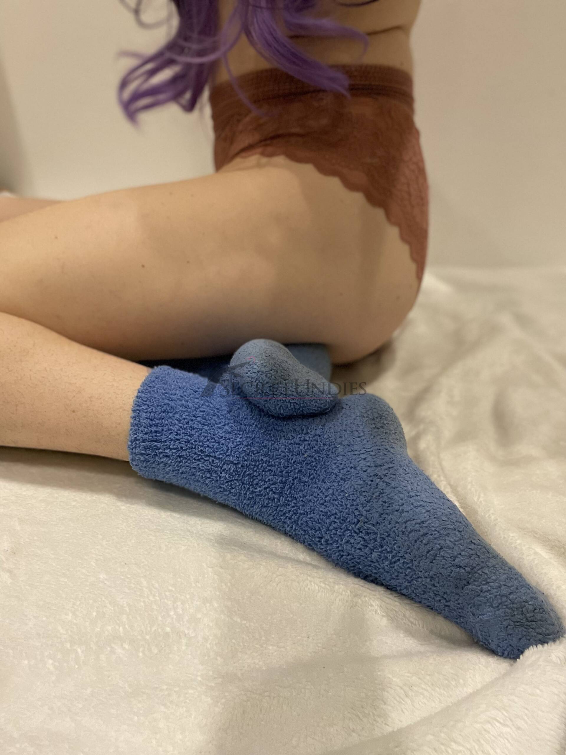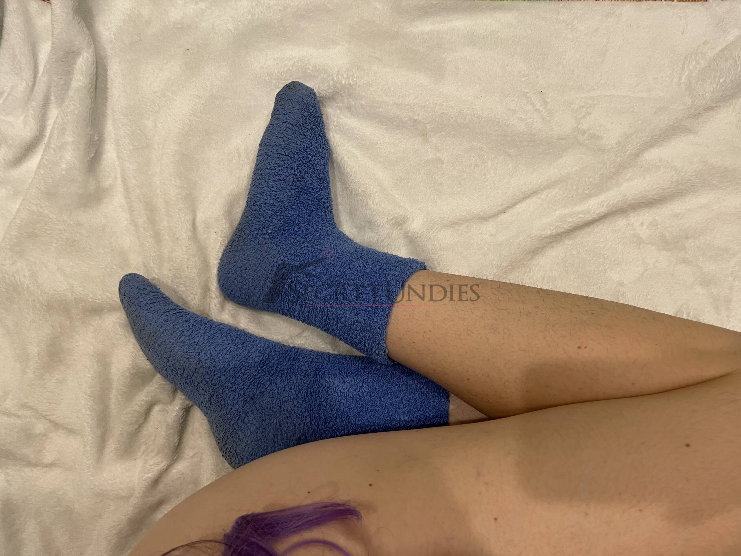 Diese meeresblauen Wollsocken sind weich, flauschig und wurden über längere Zeit intensiv getragen. Sie zeigen sichtbare Abnutzungen und haben einen deutlichen Fußgeruch, der durch häufiges Tragen, auch an heißen Tagen, entstanden ist.