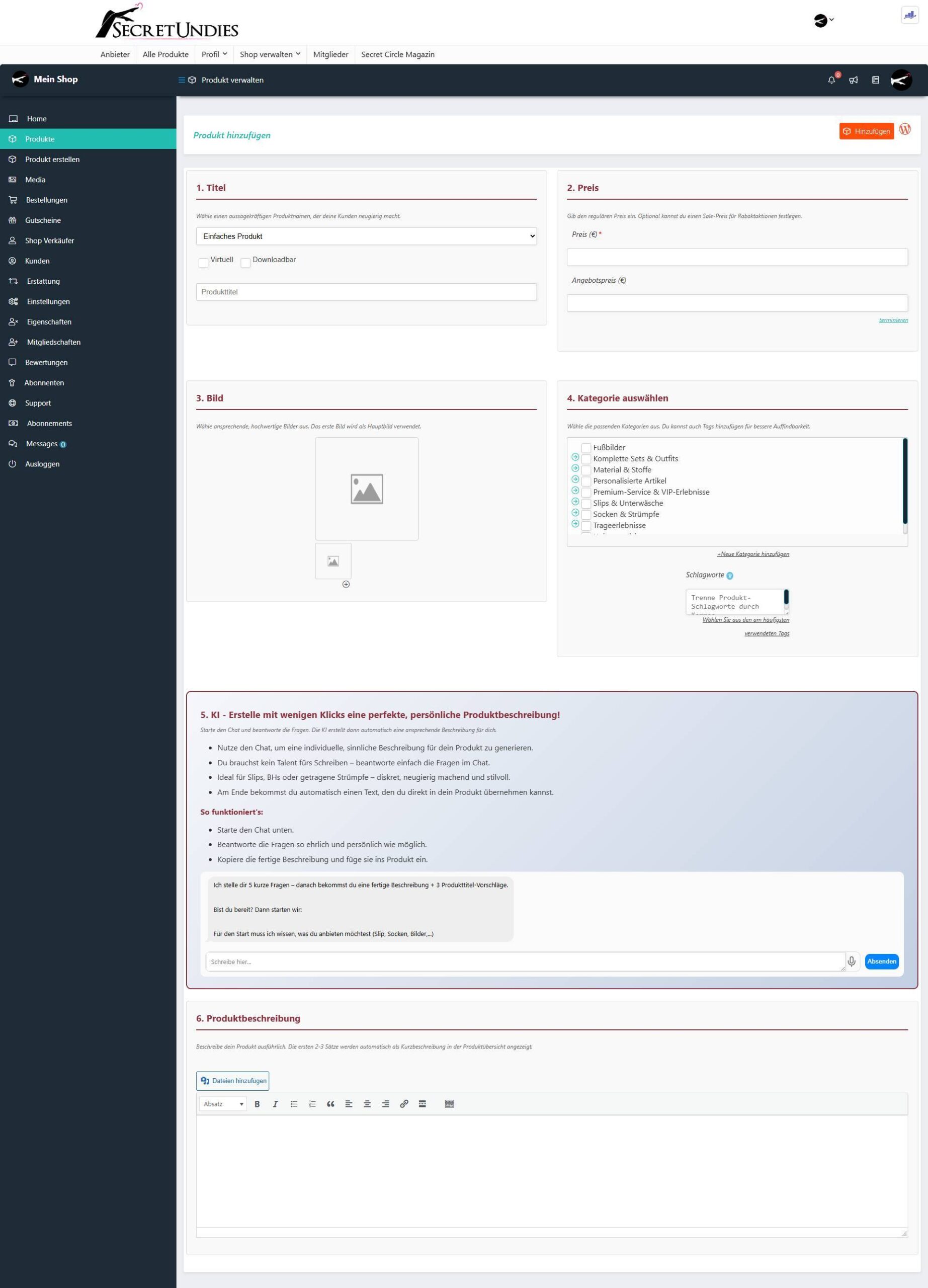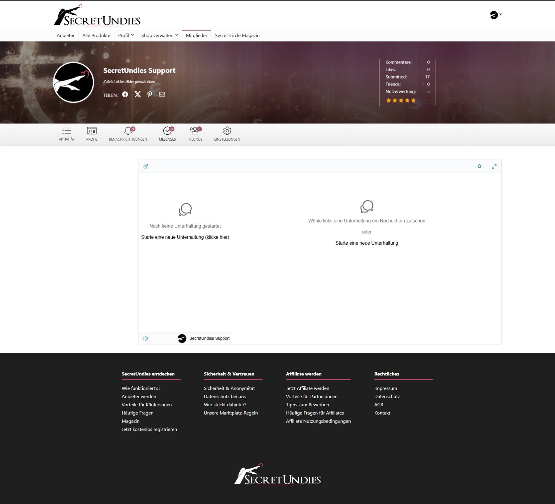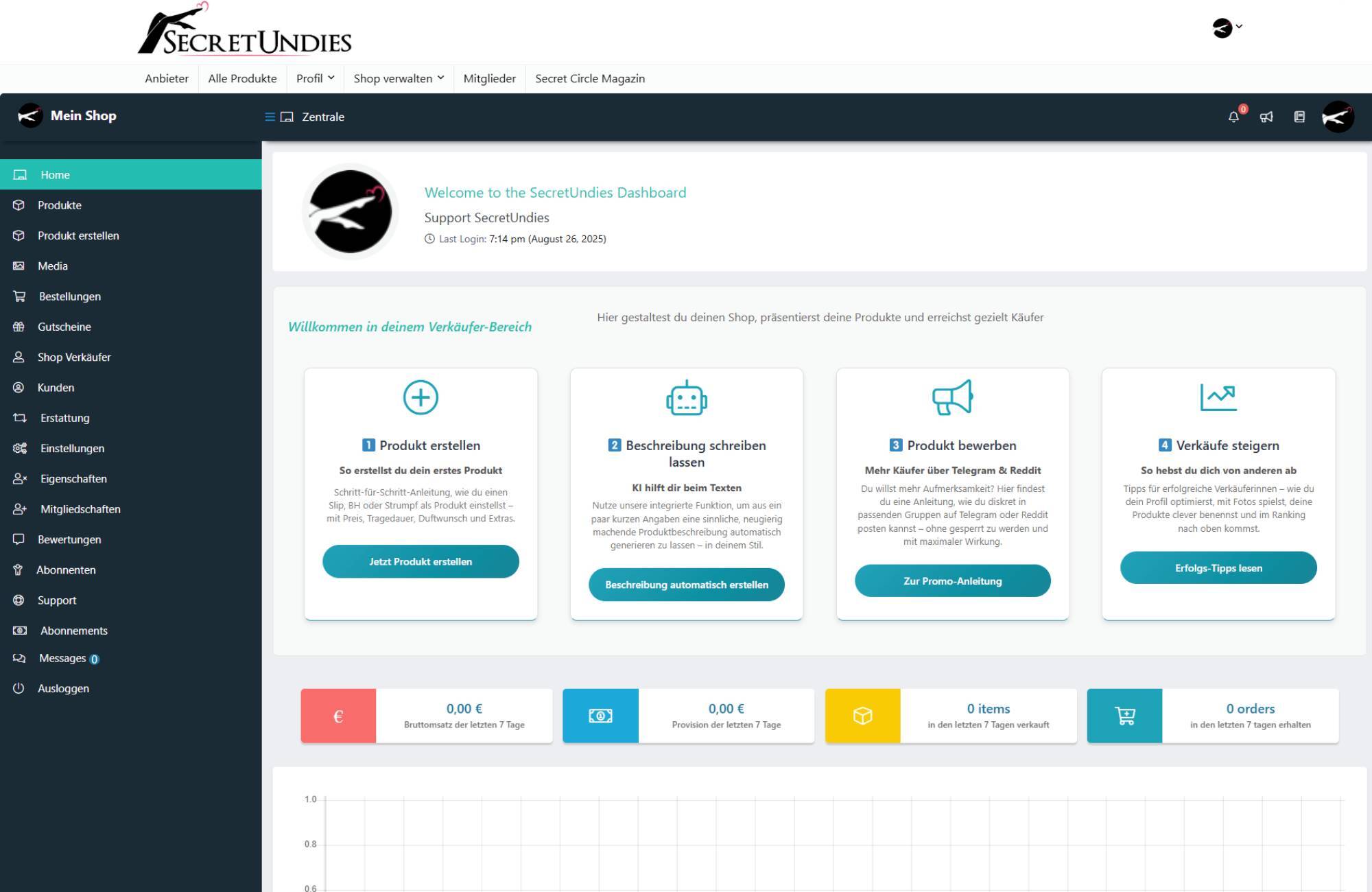 Bei SecretUndies kannst du ganz anonym und ohne Gesicht zeigen deinen eigenen Shop eröffnen. In wenigen Minuten bist du startklar und kannst sofort Produkte anlegen, Kunden empfangen und über unseren sicheren Chat kommunizieren – ohne dass jemand deinen echten Namen oder deine privaten Daten sieht.