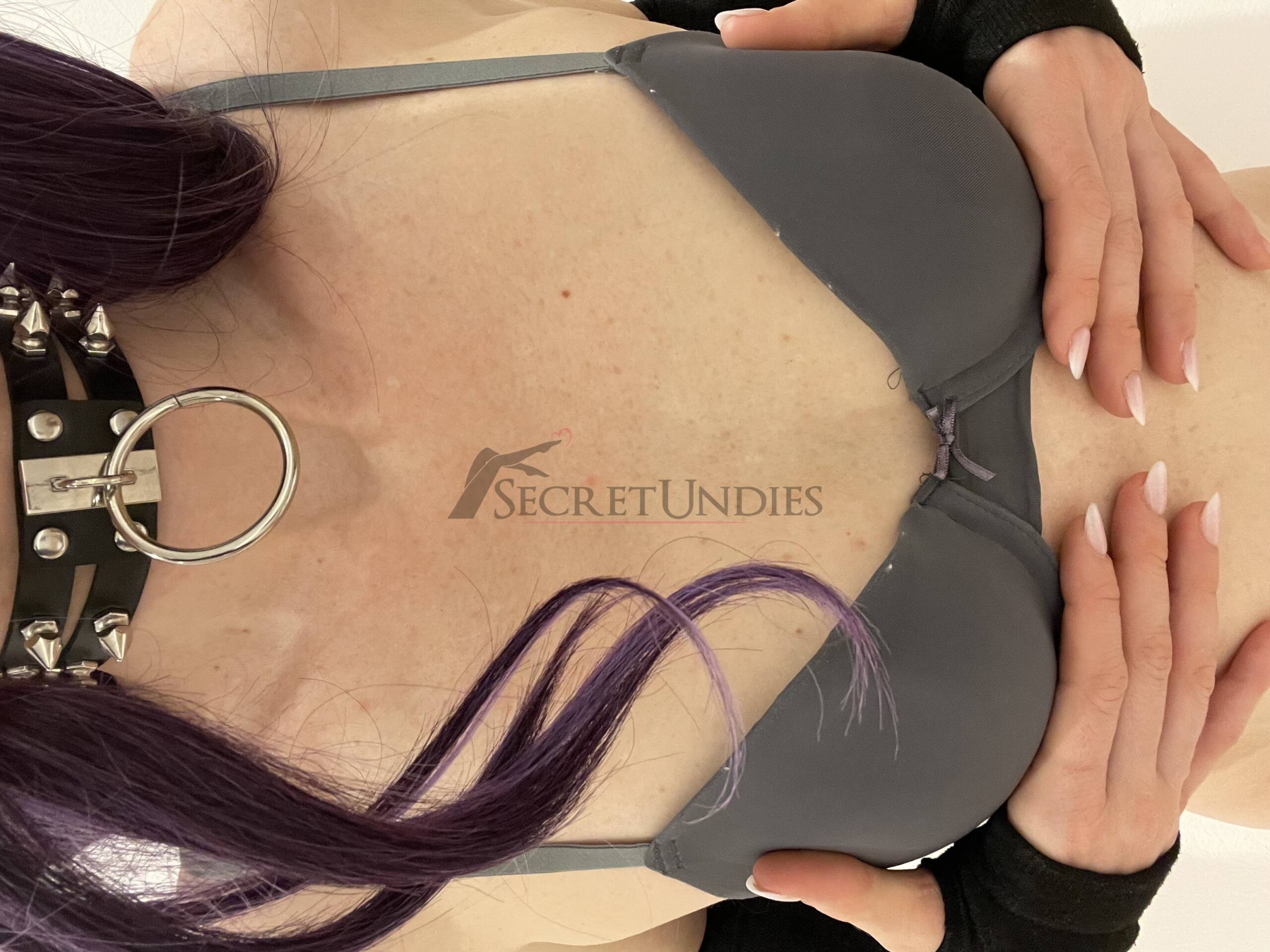 Dunkelgrauer BH, geschätzte Größe 75A, glatte Oberfläche, der Umfang zum Schließen ist mit einem feinen Netz versehen. Mindestens eine Woche durchgehend getragen, auch an heißen, verschwitzten Tagen. Körpergeruch ist deutlich erkennbar. Komfortables Design für jeden Tag.