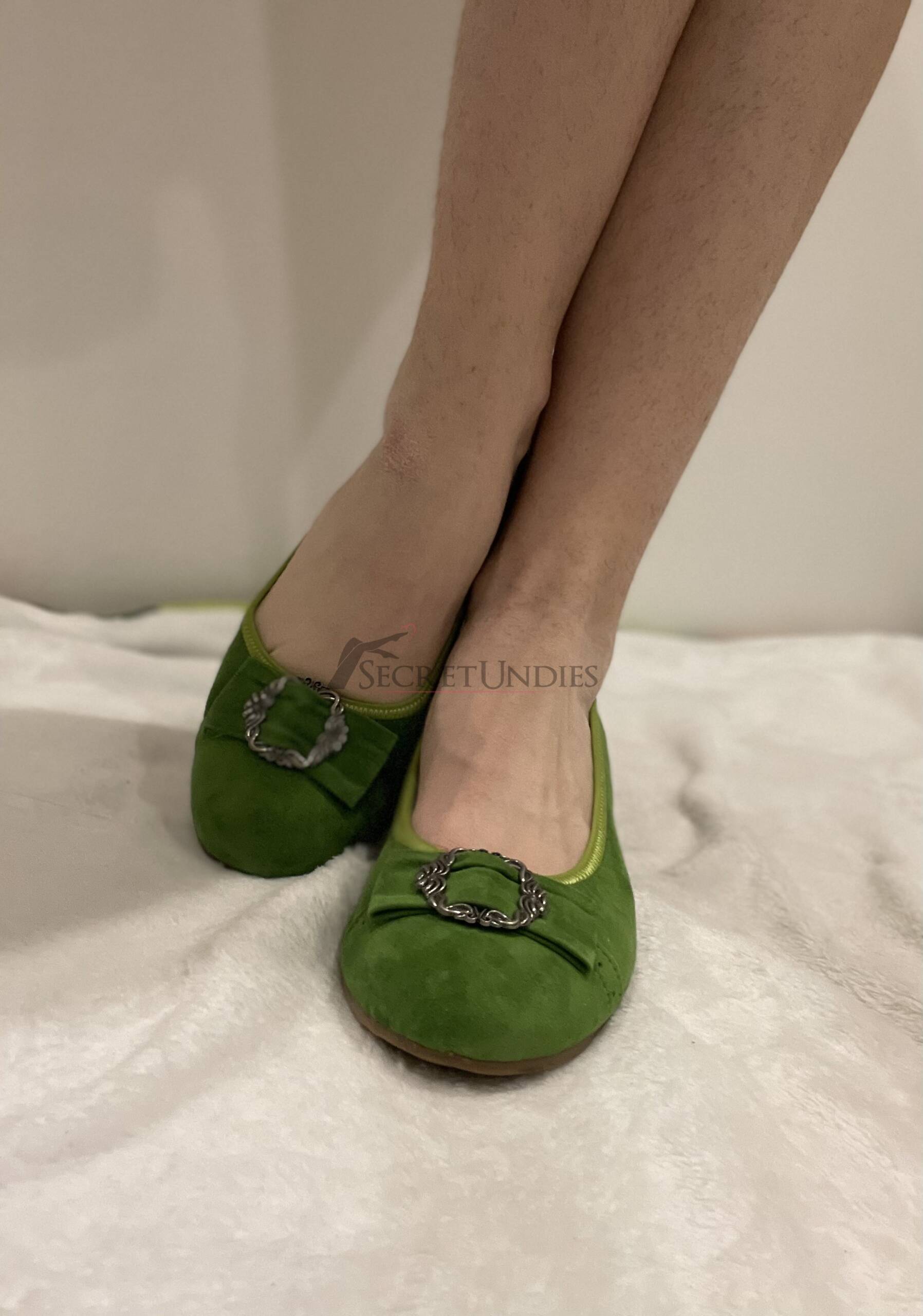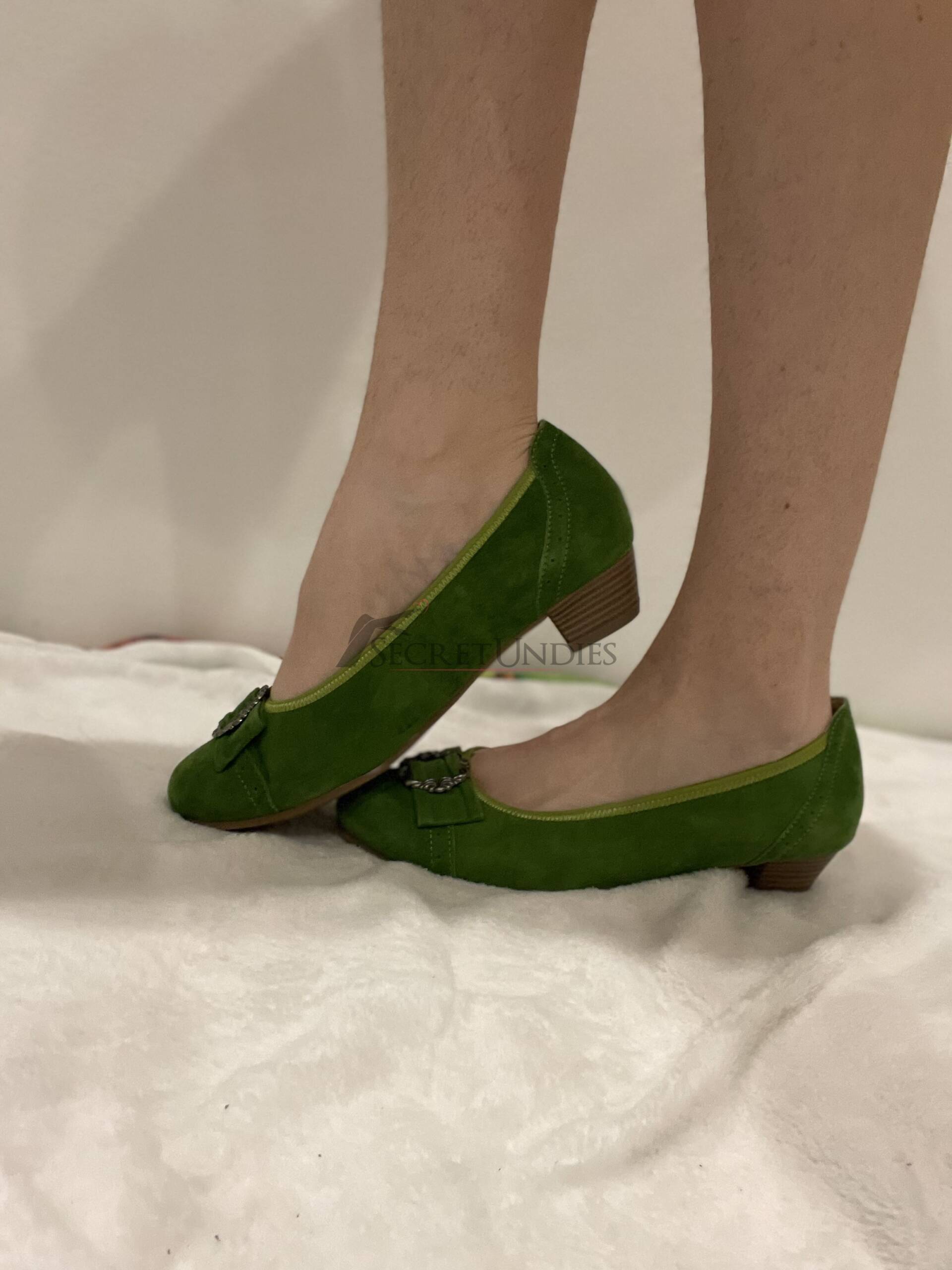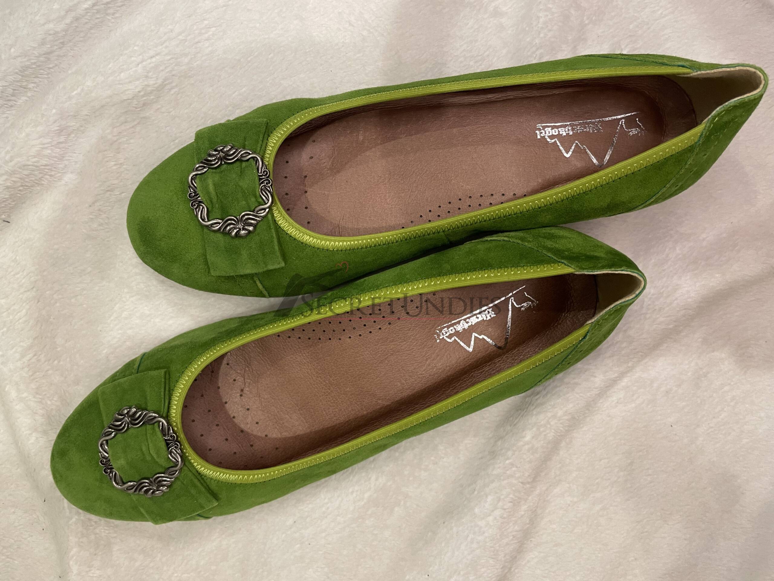 Diese grünen Hirschkogel Ballerinas haben einen kleinen Absatz von 2 cm, Größe 40, und wurden regelmäßig getragen. Gebrauchsspuren sind sichtbar, der Fußgeruch ist leicht wahrnehmbar und unterstreicht die intensive Nutzung.