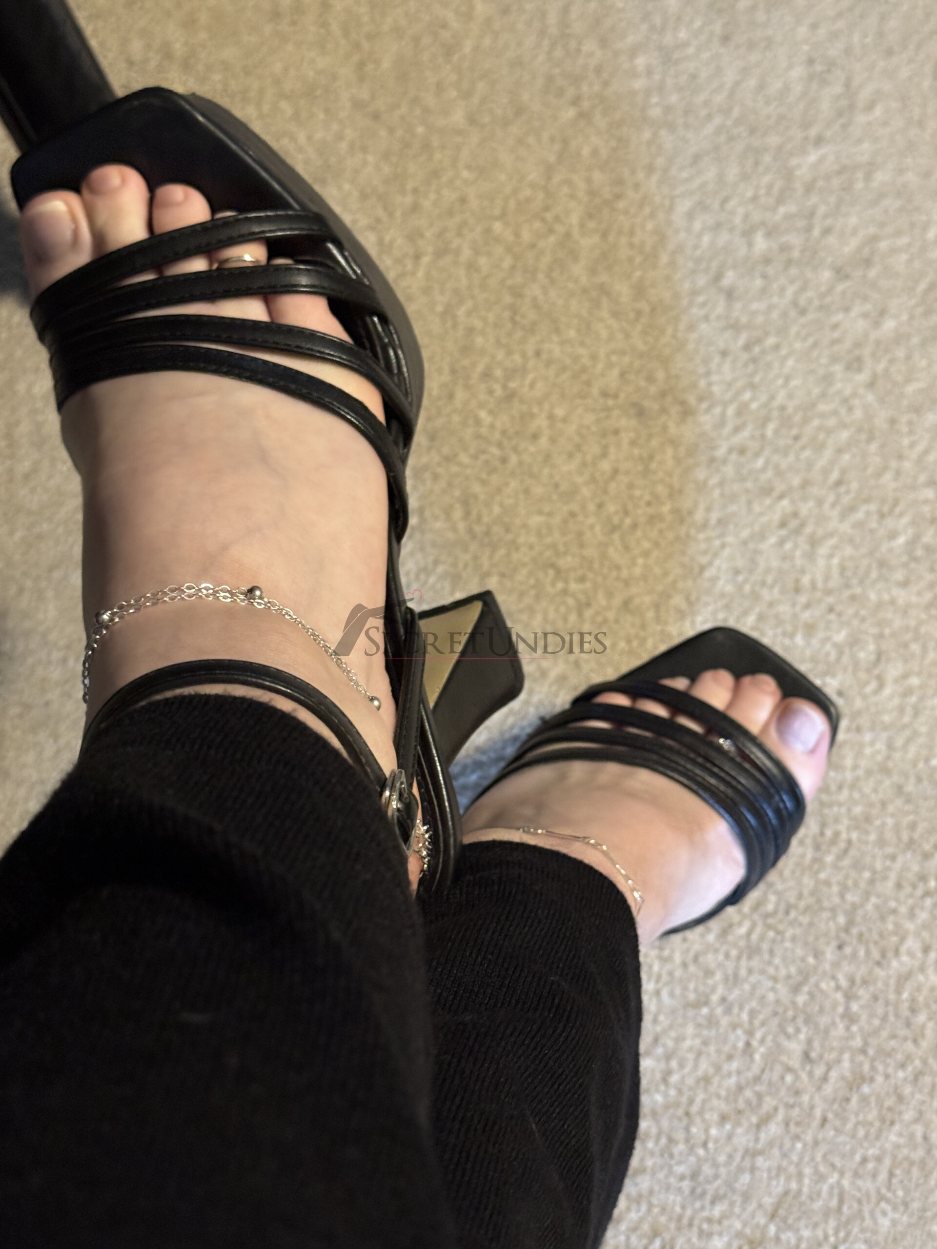Schwarze, elegante High Heels mit feinen Riemchen umspielen den Fuß, kombiniert mit zarten Fußkettchen. Der Look wirkt feminin, stilvoll und leicht verführerisch. Die Schuhe sind 14cm hoch und gebraucht inder Größe 36 Weiterlesen