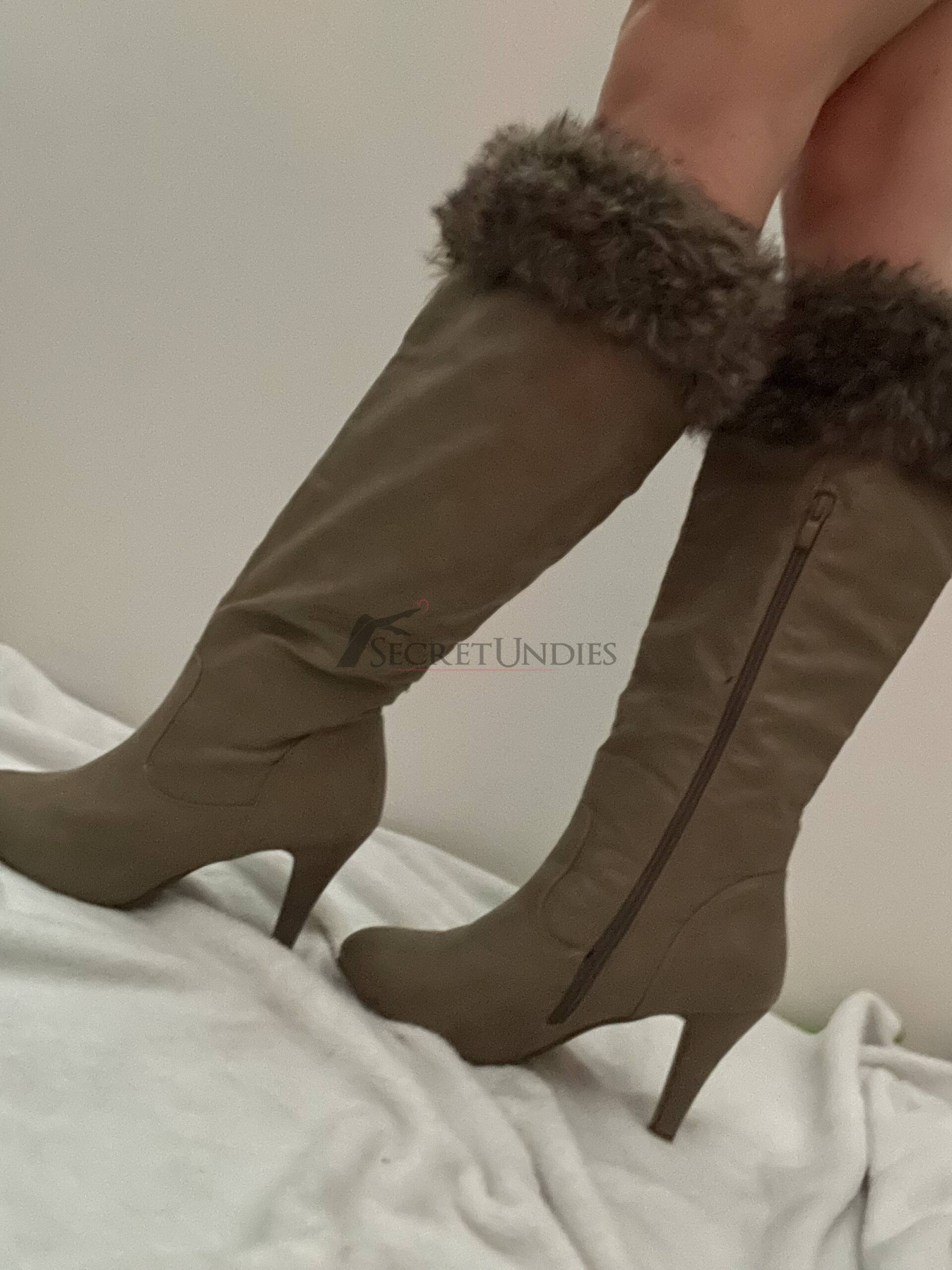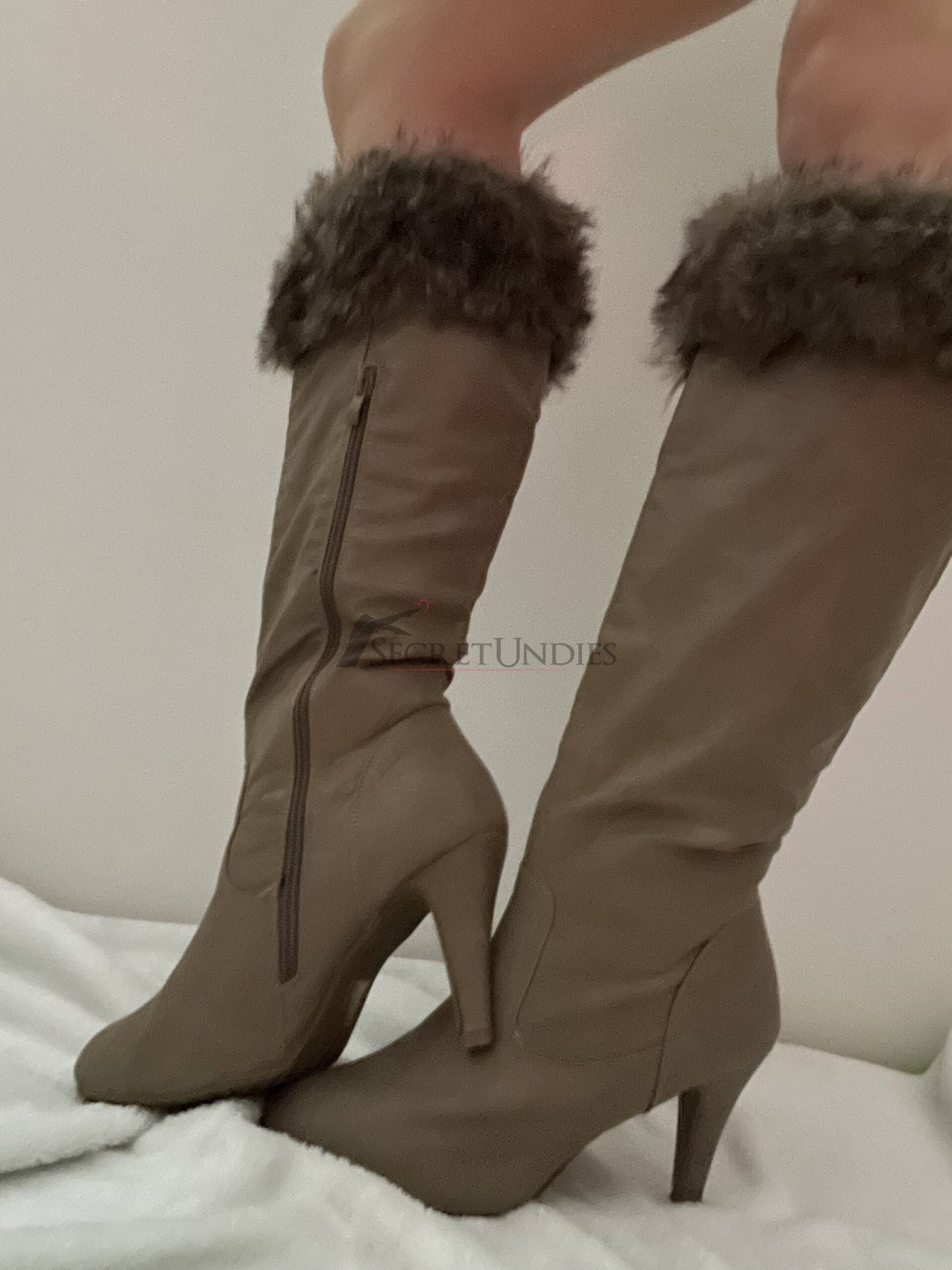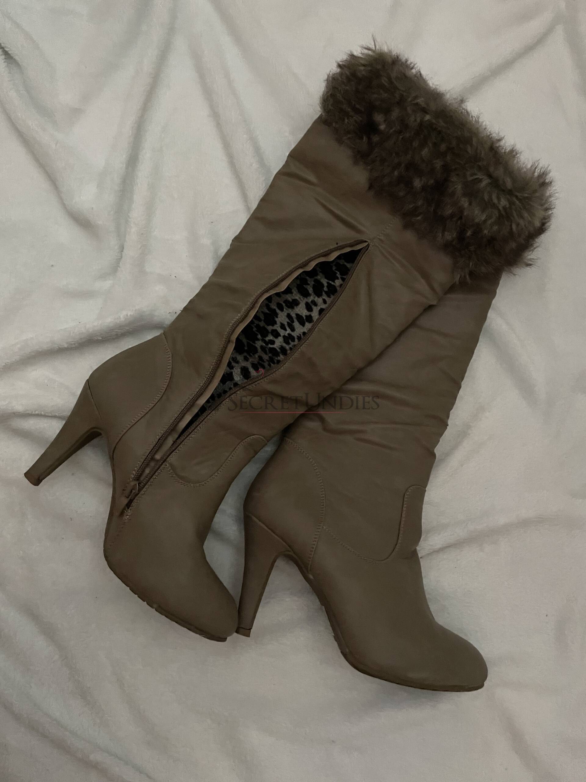 Winterstiefel in beige-braun, fast kniehoch, mit künstlichem Fellrand oben. Innenfutter im Leo-Muster, Absatzhöhe ca. 9 cm. Sehr gemütlich und warm, Marke leider nicht ersichtlich.