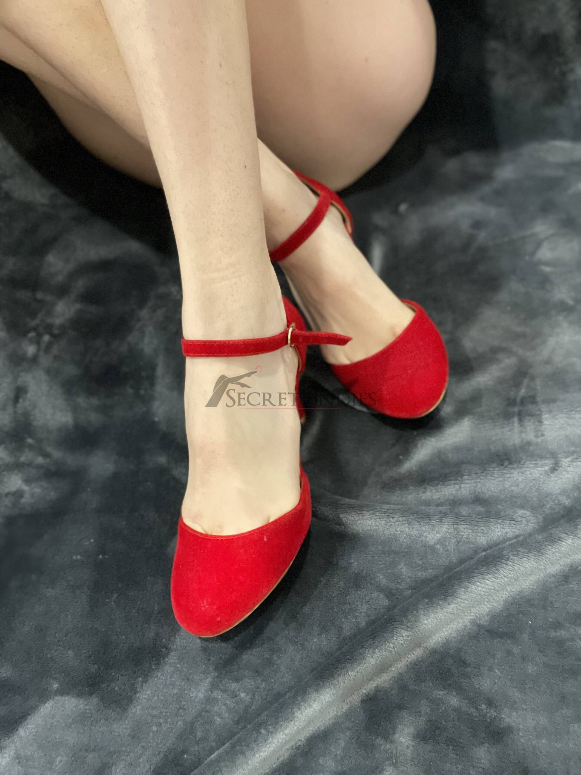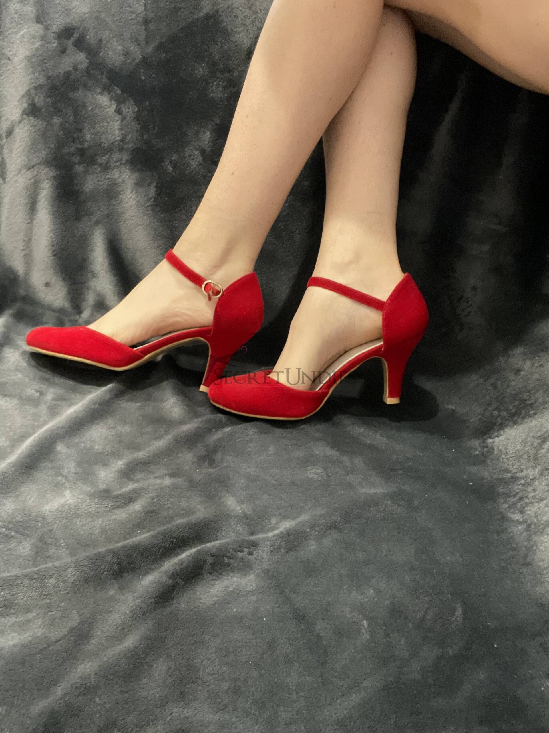 Die Schuhe haben eine sehr weiche, samtige Oberfläche und eine kräftige, knallrote Farbe, die sofort ins Auge fällt.