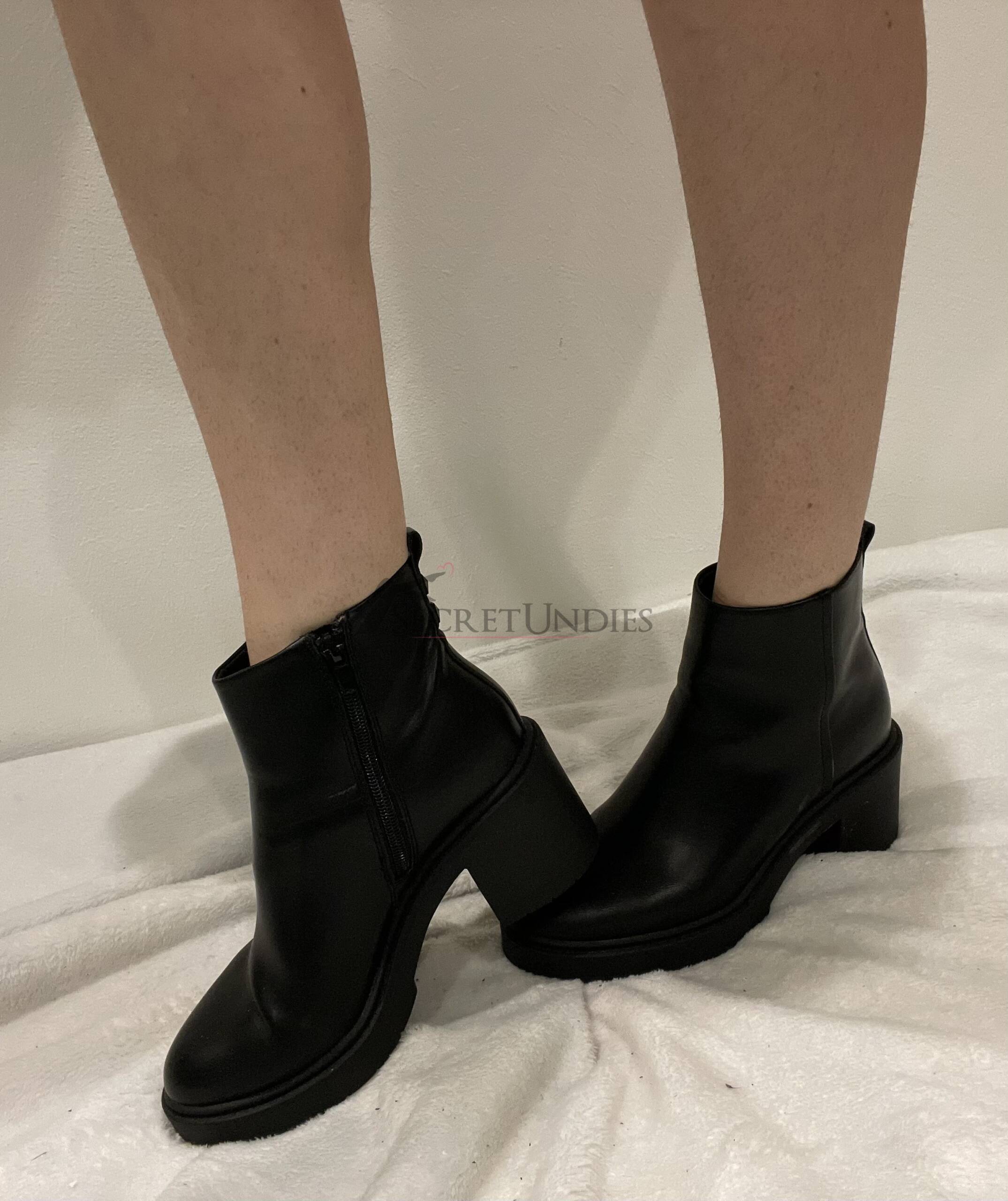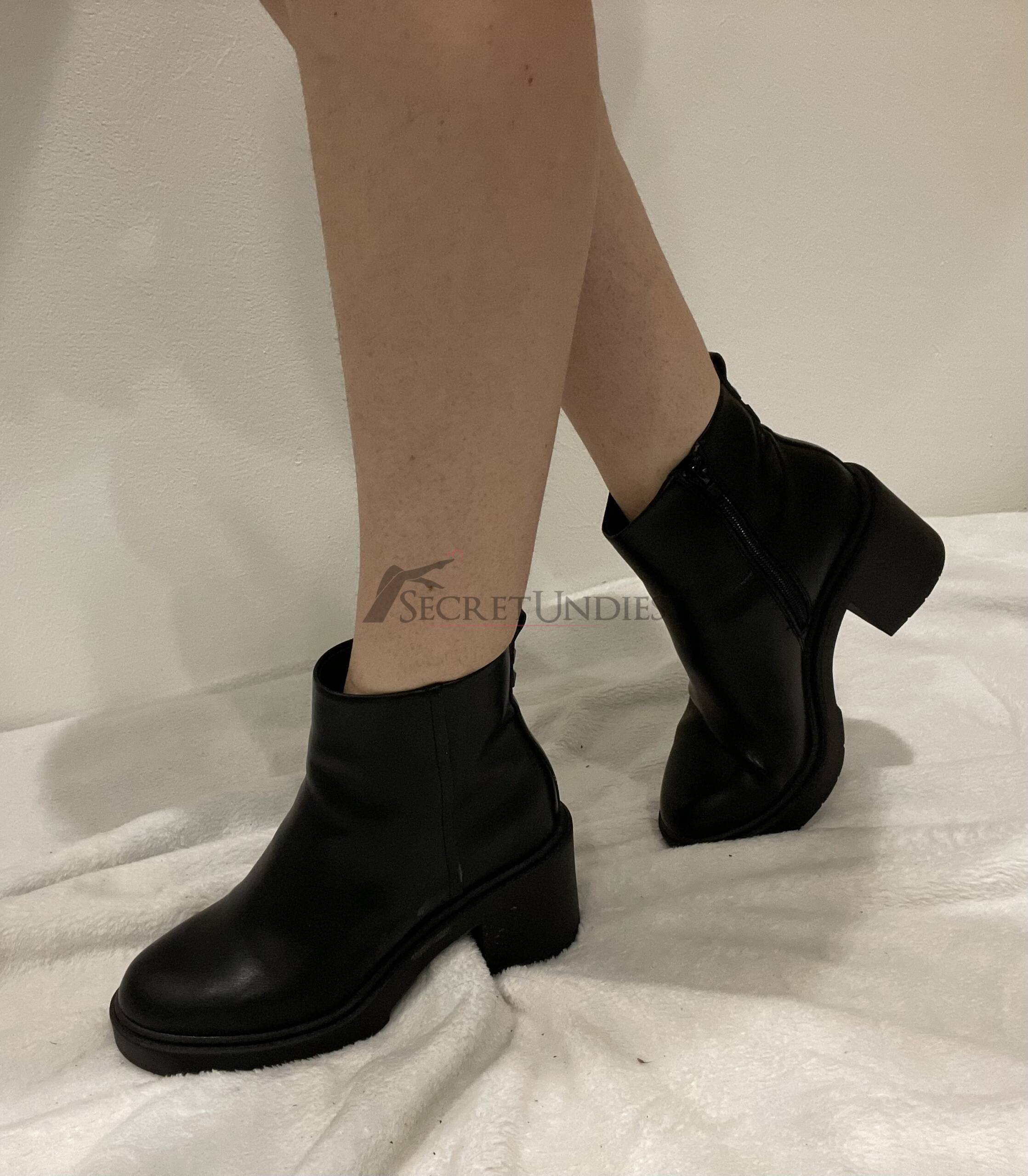 Glatter schwarzer Lederlook, die Schuhe reichen leicht über den Knöchel hinaus und haben einen Absatz von ca. 5 cm.