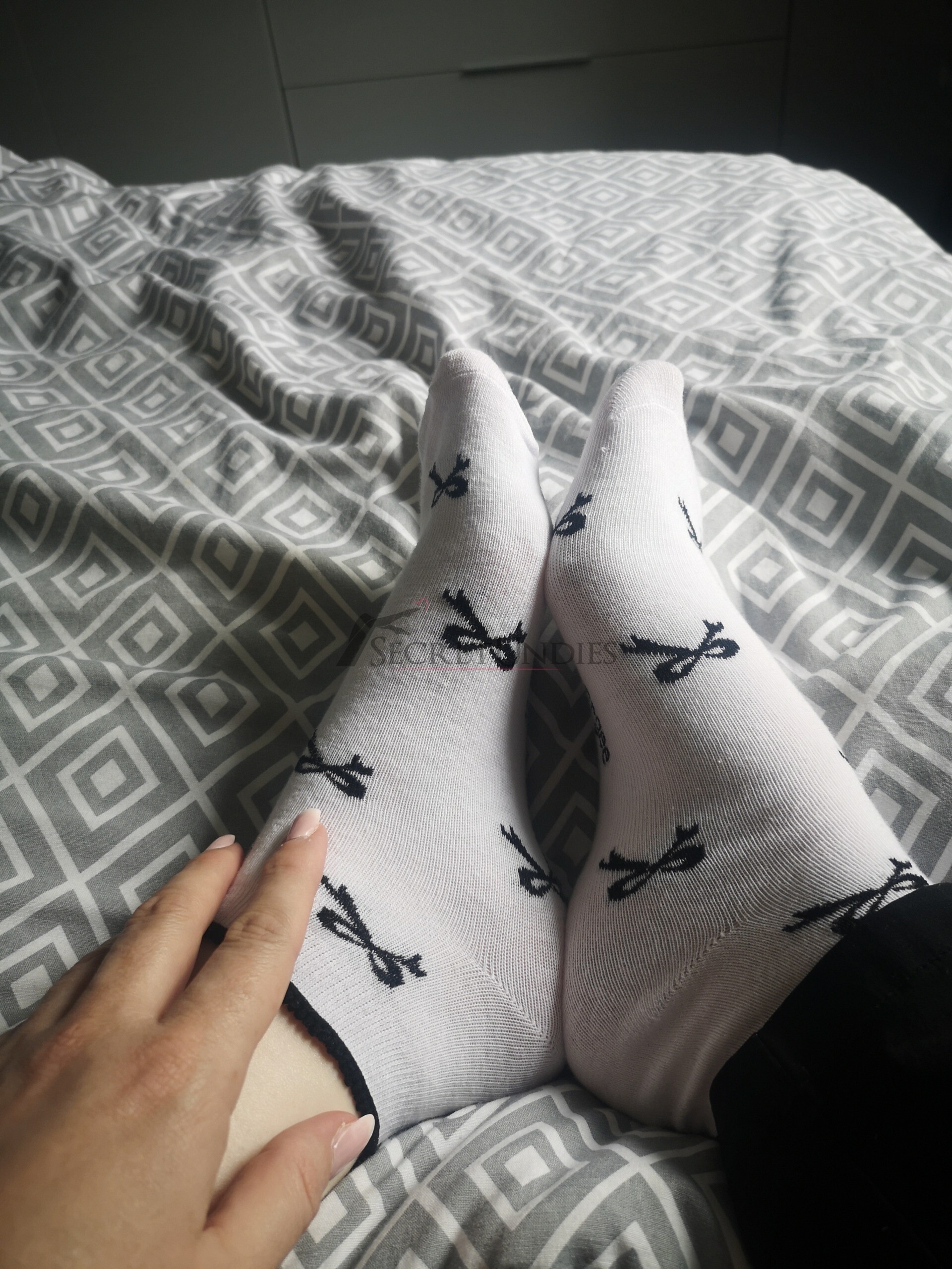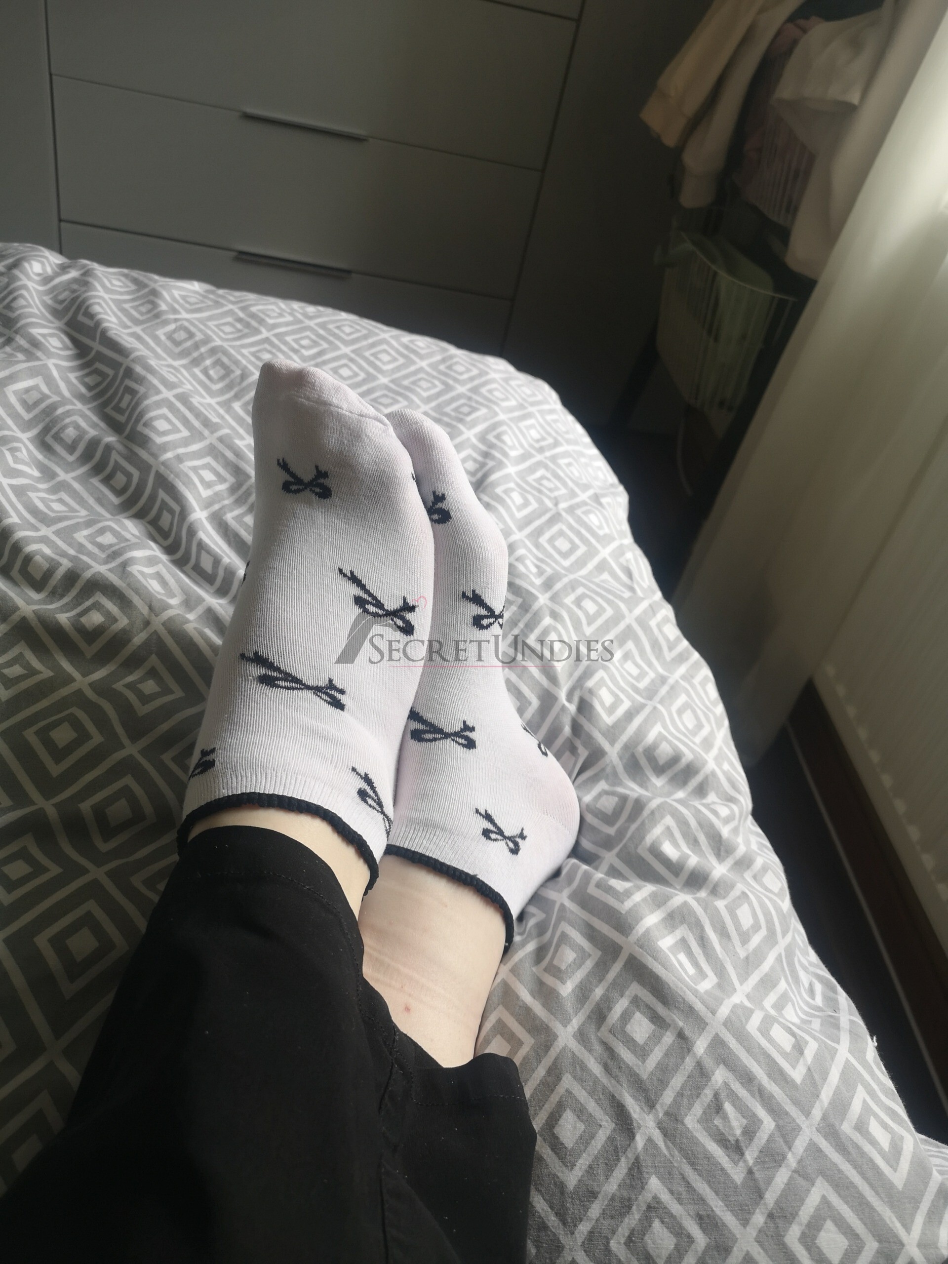 Sneaker Socken, weiß mit schwarzen Schleifen drauf. Sie sind Gr. 39-42. Die Socken sind getragen im Alltag, in Schuhen und in der Wohnung. Sie wurden 2 Tage hintereinander getragen.