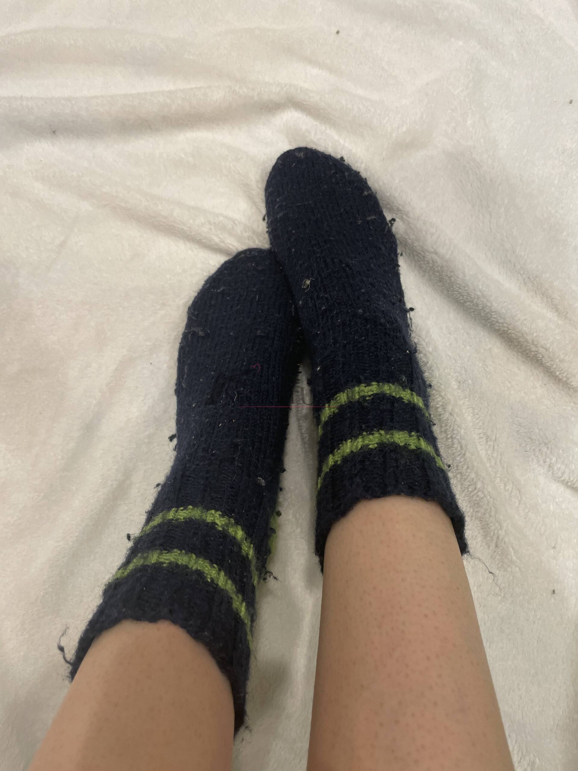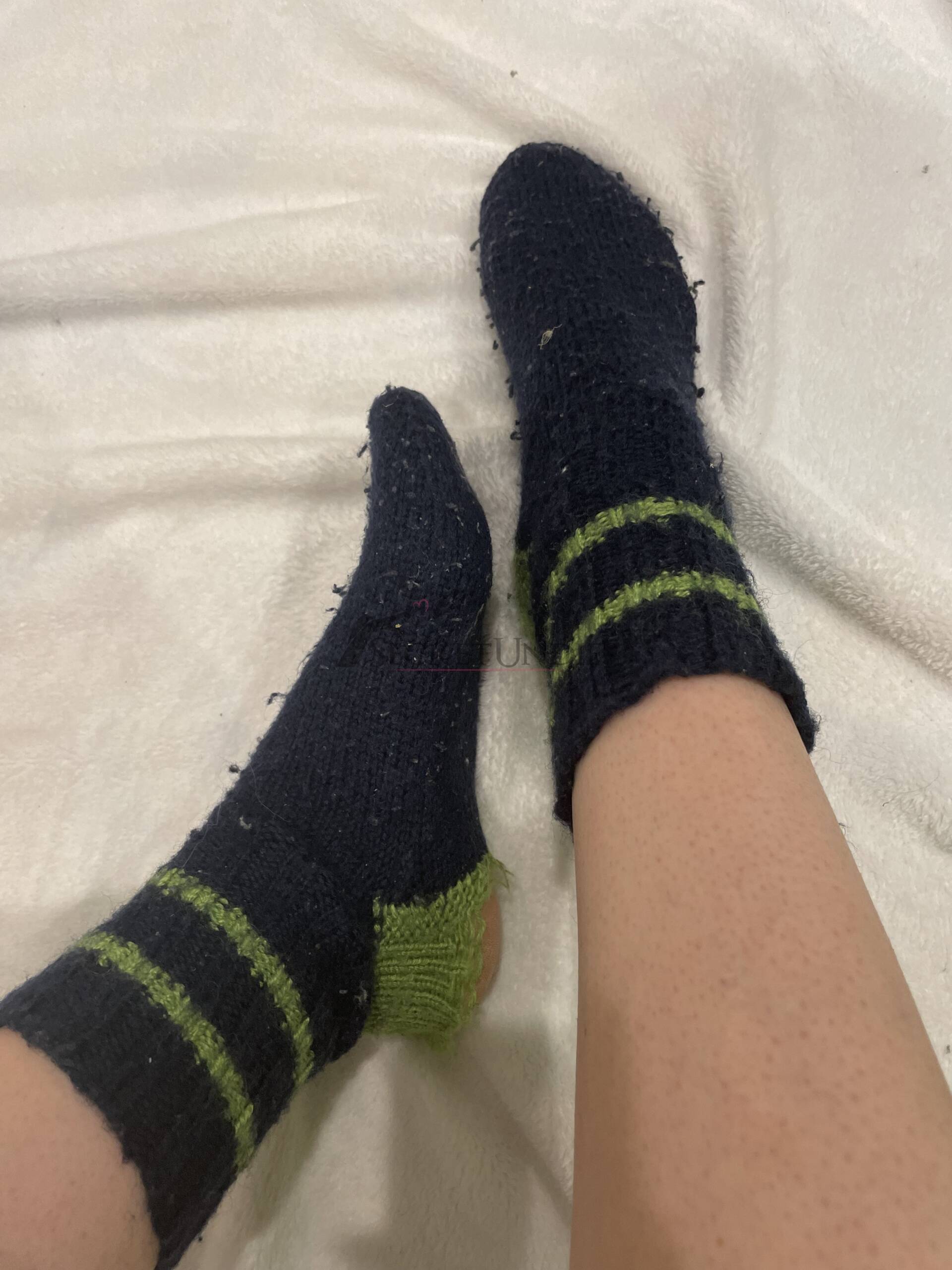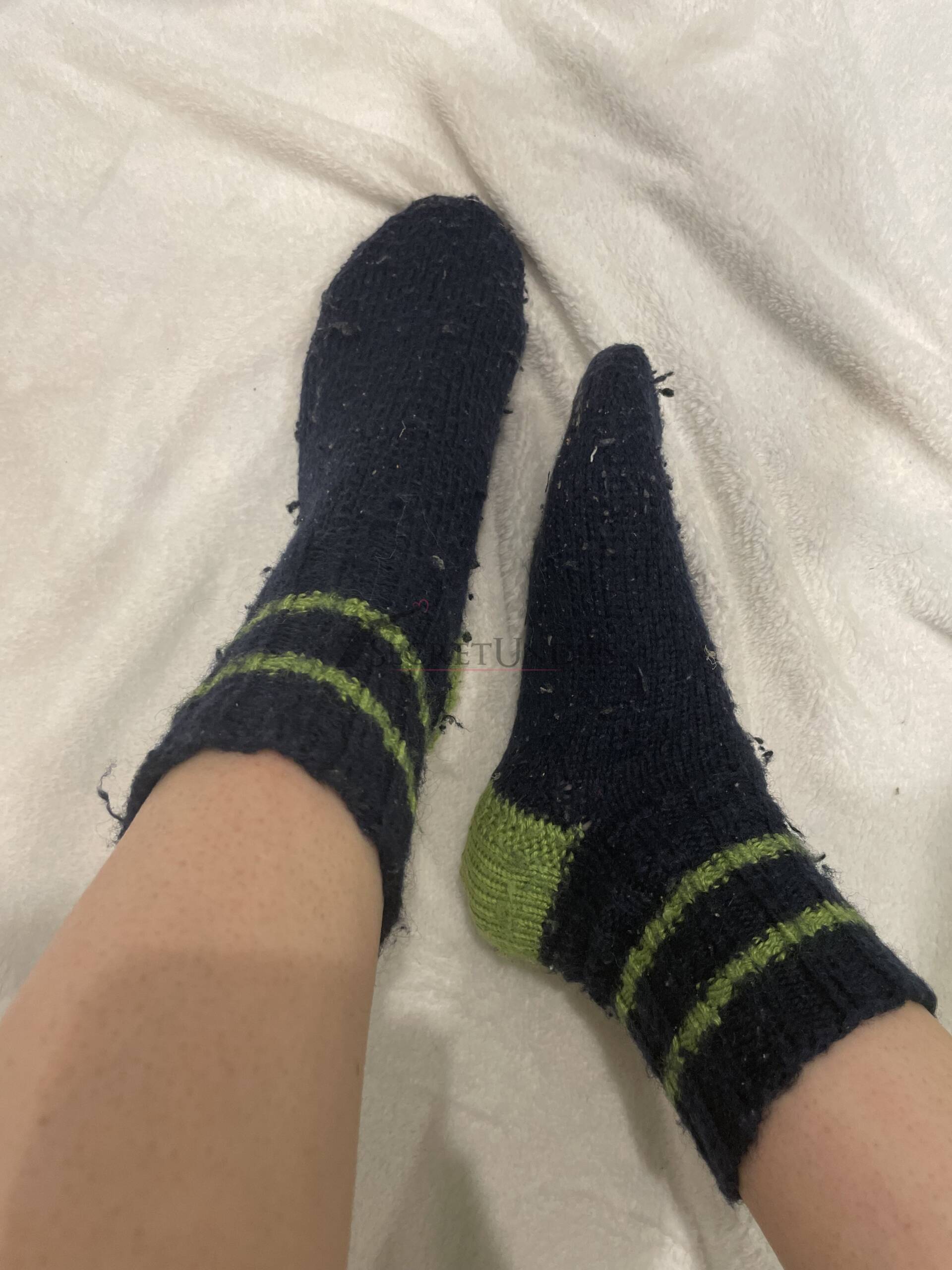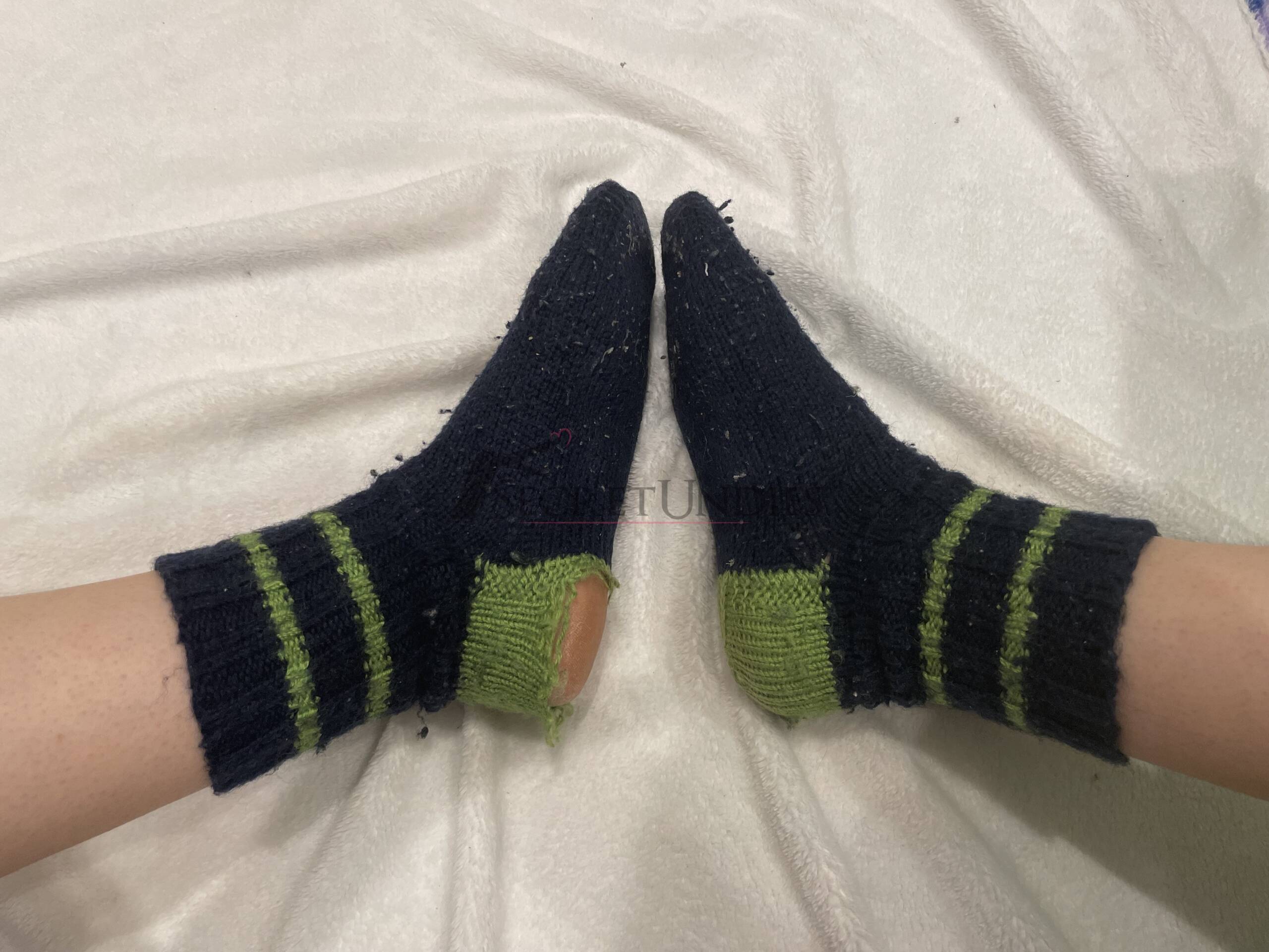 Dunkelblau-grüne Wollsocken mit deutlichen Abnutzungen und einem Loch an der Ferse. Sie wurden intensiv getragen und sind perfekt für Liebhaber authentischer, stark genutzter Stücke.