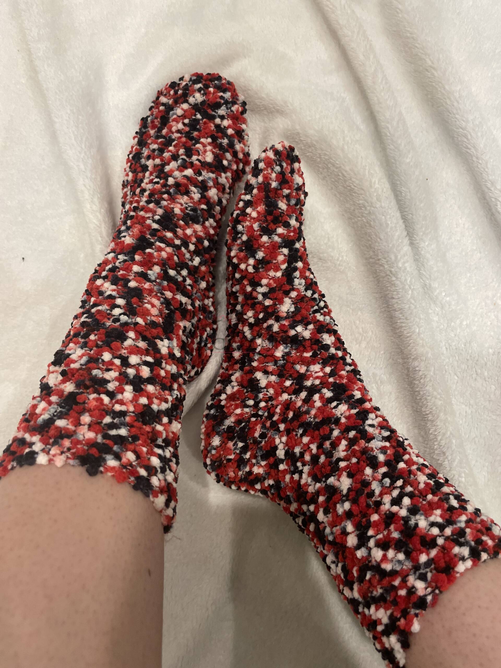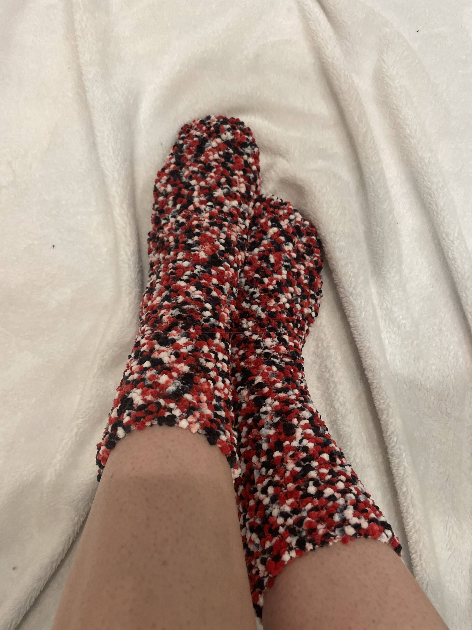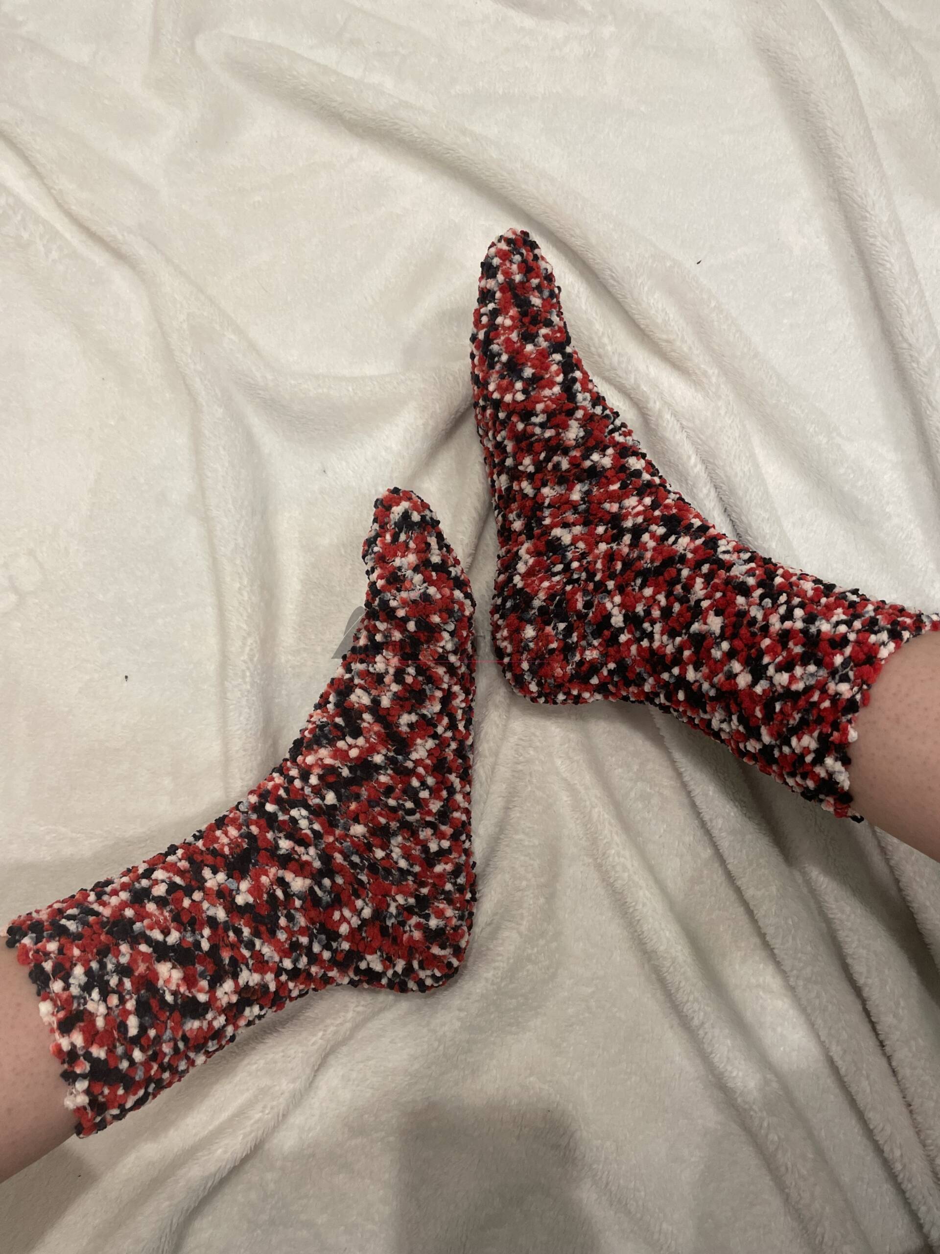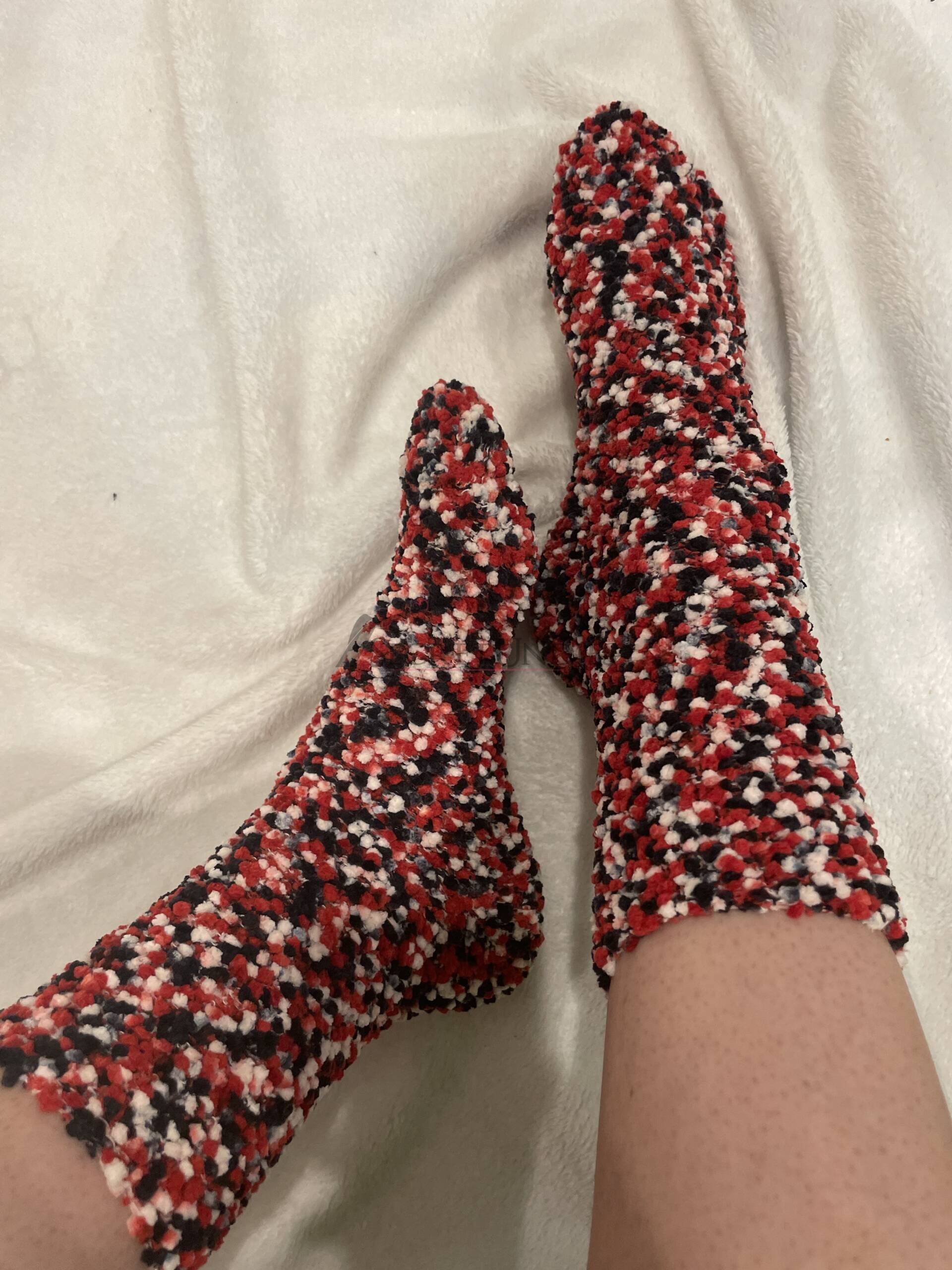 Diese flauschigen Socken in Rot-Schwarz-Weiß sind besonders weich und angenehm zu tragen. Sie wurden oft genutzt und bieten ein warmes, gemütliches Gefühl. Das Material ist deutlich eingetragen und ideal für Liebhaber flauschiger Texturen.